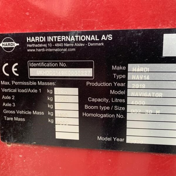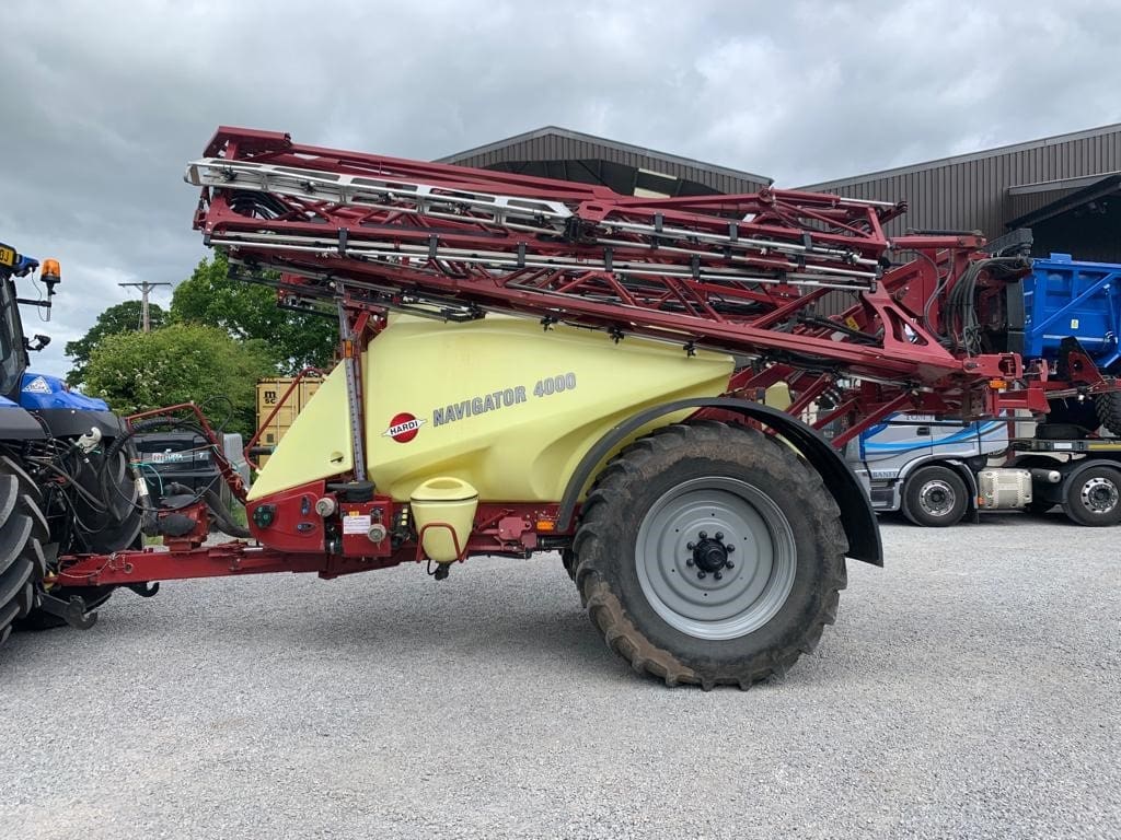 Hardi Navigator 4000, year 2019/2020, 4000 litre tank, 30m tri fold booms, 500ltr rinse tank, dynamic fluid4, 464H pump, 13 section EFC with auto section control through HC8600 terminal, boom prime, stainless steel lines, triplet nozzle bodies, auto slant boom height, axle suspension, fast filler with hose & filter, Intellitrack, 460/80R38 tyres.