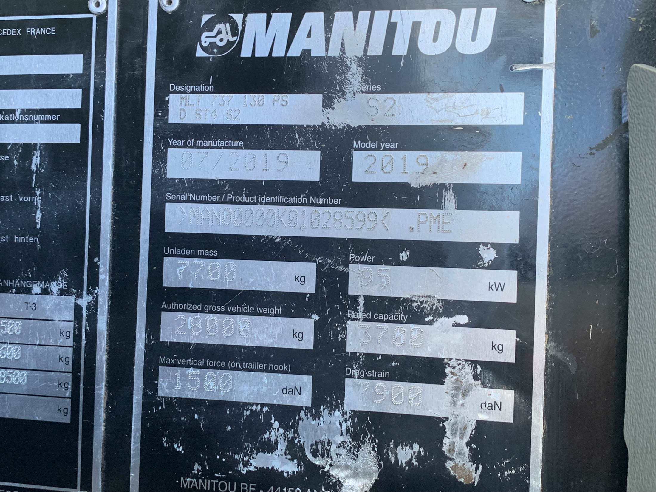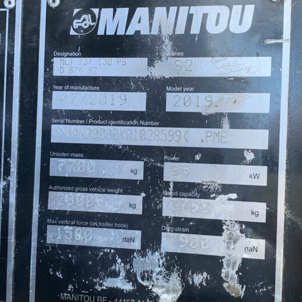 Manitou MLT737-130PS Telehandler, year 2019, 2631 hours, Elite Spec, Air Seat, Air Con, Vision performance monitor, Manitou hyd headstock, Hyd locking, Rear hitch, 24 inch wheels @ 50%.