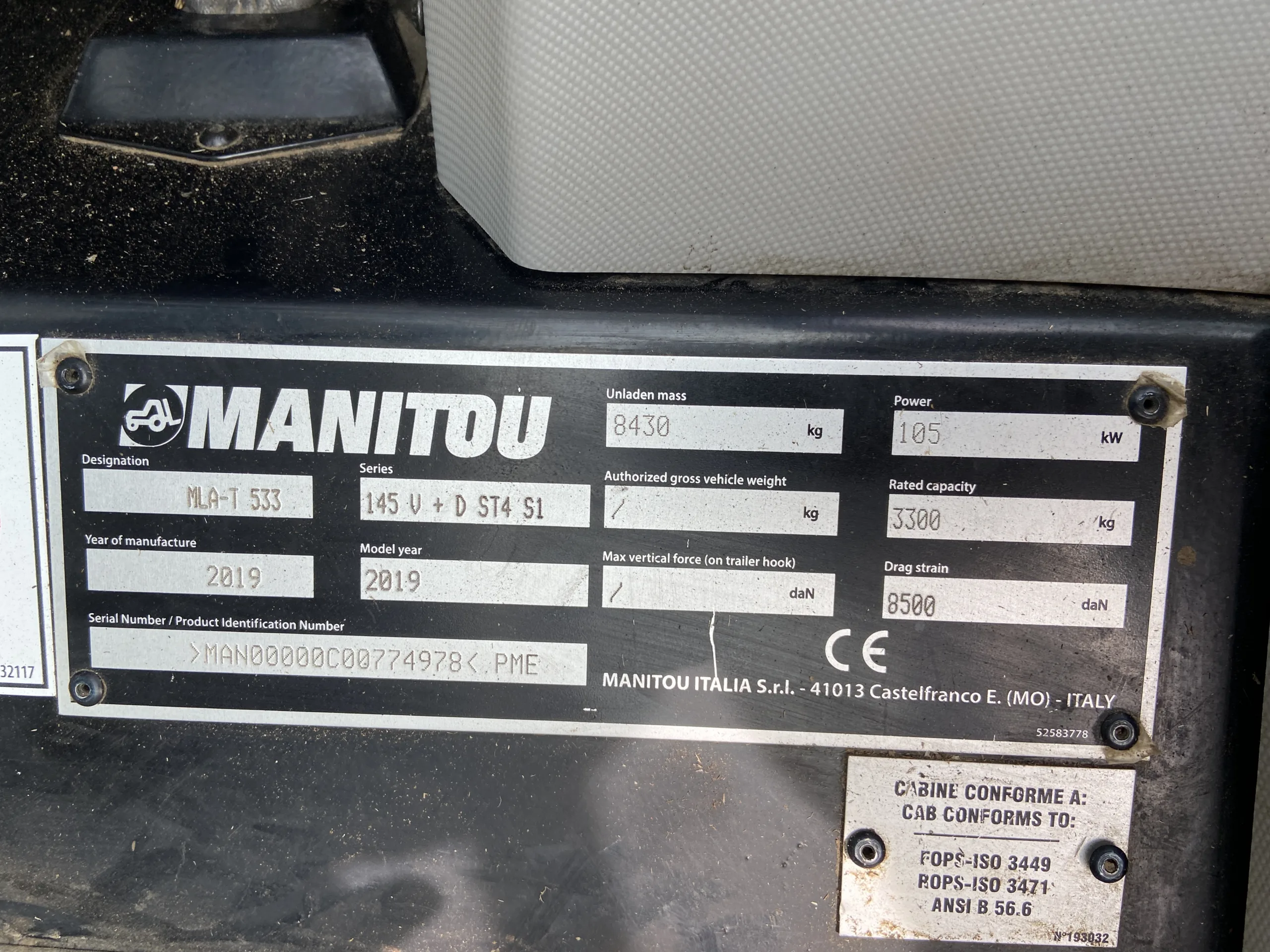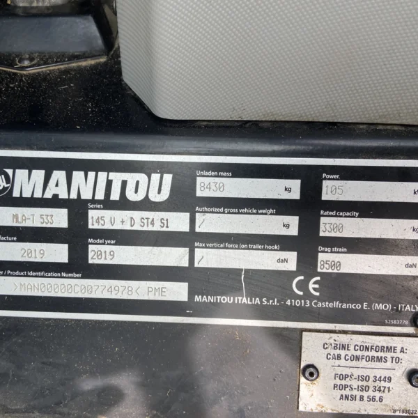 Manitou MLA 533-145 V Telehanlder, year 2019/ 2020, 2848 hours, Ex Hire – Elite Specification, Deutz 143Hp engine, Max lift height 5.20m, Max lift capacity up to 3300kg, 158l/min hydraulic pump, 40Kph M-Varioshift, Pin & Cone hydraulic headstock, 3rd Service, Pallet tines, CRC Boom Suspension, ECS Easy Connect System, LED Lighting, 24 inch tyres, Air Conditioning, Air Seat, Bluetooth radio, JSM joystick.