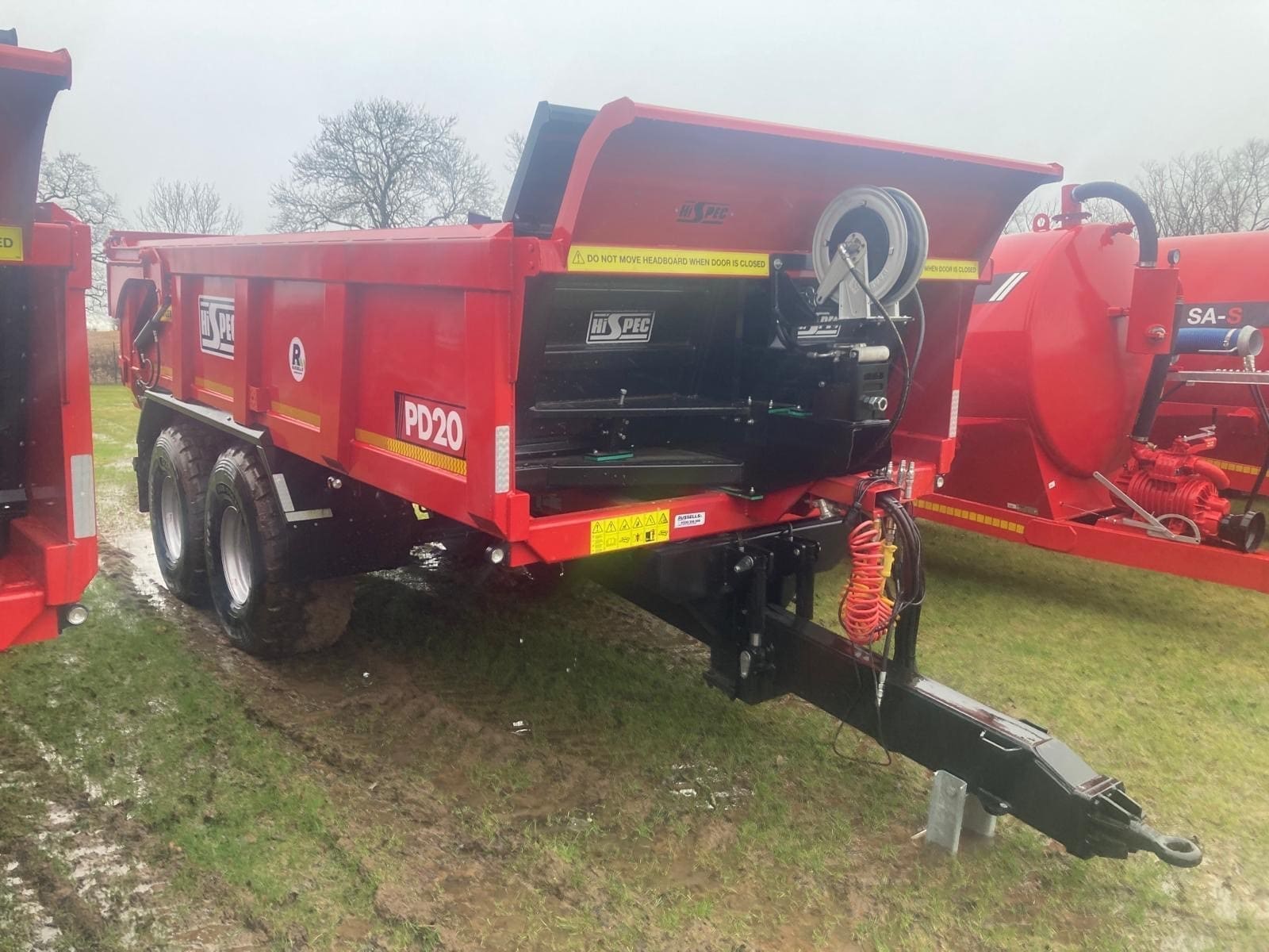 Hi Spec PD20 Push Off Dump Trailer, hydraulically operated moving floor type headboard, hydraulic sprung drawbar c/w bolt-on swivel hitch, up & over hydraulically operated rear door, 525/65 R20.5 73F tyres, Parabolic sprung tandem axles (non-steering), Air/hydraulic brakes, LED road lights, Reversing lights x 2, Strobe beacon, Brackets suitable for up & over cover.